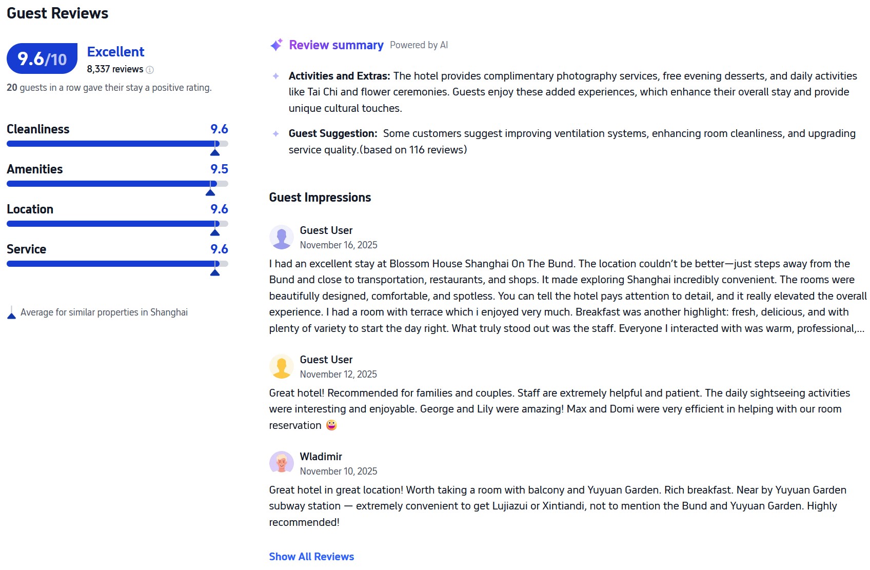 With its prime location, luxurious rooms, personalized service, and authentic dining, Blossom House Shanghai On The Bund continues to win hearts—and high ratings—on Trip.com. Whether you’re planning a romantic getaway, a family vacation, or a business trip, the real stories from past guests speak volumes.